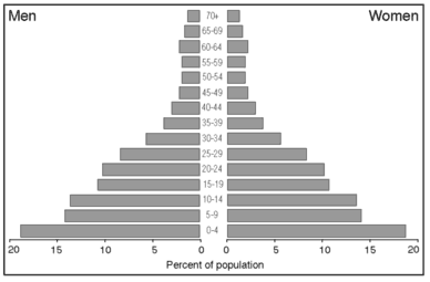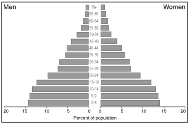 ResultsThe most striking aspect of the projections is that they indicate a very rapid population growth in the next 20 years, with nearly a doubling of the population, see table 2.18 and figures 2.11 and 2.13. This is the case for all alternative projections, almost regardless of fertility decline and migration assumptions. The reason for this is that the high past and current fertility rates have resulted in a large number of young people in the population. The total number of children borne by these persons in the future will be large, even if each individual has few children on average.