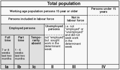 Based on a person's activities in the so-called "determinant week" the labour force framework divides the population, 15 years or older, into three exhaustive and mutually exclusive categories3. "Employed" (box Ia, Ib and Ic above) comprise all persons who worked at least one hour in the reference week, or persons who were temporarily absent4. "Unemployed" (box II above) are persons who did not work even one hour, but who at the same time actively sought work. Employed and unemployed persons together make up the "currently economic active population" or "labour force". Persons 15 years or older who are not "currently economic active" and persons outside the survey population together make up the "not in the labour force" category (box III and IV above).