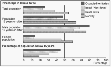 Figure 7.2 International comparison of labour force participation ratios Figure 7.2 clearly illustrates the inverse relation between the share of the total population in the labour force and the share of the population below 15 years of age. The very young age structure in the occupied territories is thus a major explanation of the relatively low labour force participation as per cent of the total population8.