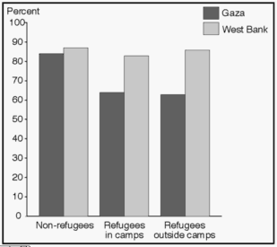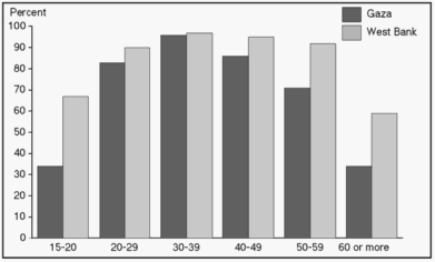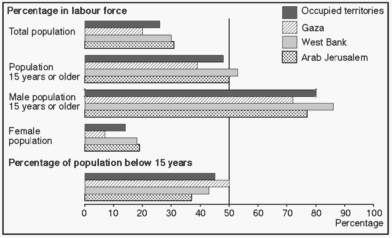 regional differences in adult male labour force participation. It is reasonable, therefore, to think that overall differences in male labour force participation between regions and socio-economic groups are due to economic and political factors, rather than age composition, measurement problems and cultural factors. While economic and political factors hardly can be measured directly, there are many indicators which support this hypothesis. Variations in male labour force participation are very similar to the variations in household wealth, as pointed out and discussed in the household economy chapter. In Arab Jerusalem and the central parts of the West Bank, employment opportunities are relatively good (outside camps)14. The local economy seems to be able to absorb most individuals seeking work. The reasons for non-activity among males, it transpires, are primarily education, i.e. lack of work compatible with training and status, sickness and old age. Labour activity is found to be at its lowest in Gaza and in refugee camps, i.e. the environments most strongly affected by the Israeli occupation15. Figure 7.5 illustrates the effect of refugee status on adult male labour force participation. In Gaza labour force participation among refugees is low, regardless of whether they live inside or outside camps. In the West Bank, by contrast, labour force participation is higher and there are small variations in labour force participation according to refugee status.