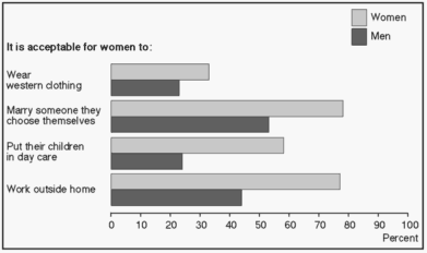Although there are clear differentials between men and women concerning appropriate dress for women, these differentials are greater between the regions than between men and women within any single region.