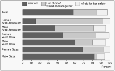 Although there are regional variations between genders, table 9.1 suggests that with respect to notions concerning proper behaviour for married women, women in Gaza tend to be more similar to women in Arab Jerusalem than to their male counterparts in Gaza. In other words, disagreements on women's roles reside mainly on the level of gender. The situation is very different if attitudes concerning women's dress are examined where region, rather than gender, seems to be decisive in conditioning attitudes. Figure 9.3 Reaction to female household members appearing in public without a head scarf by region and gender