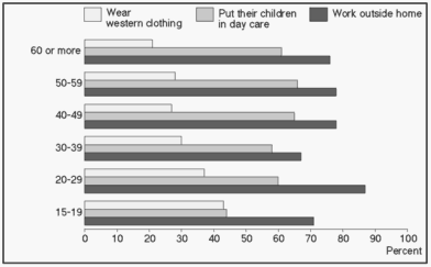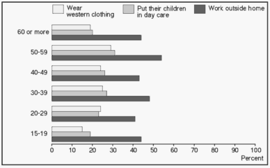 Figure 9.4 Percentage of women who approve of day care, women working outside house and western dress by age