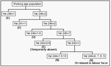 Appendix A.7Labour Table AppendixComparison with Israeli CBS Labour Force Survey for "Judaea, Samaria, and the Gaza Area".Because of the widespread reference to the Israeli Labour Force survey in discussions about employment in the occupied territories, it may be of interest to discuss the compatibility of concepts and definitions between this survey and the FAFO Living Conditions survey. Even if both surveys are based on the ILO endorsed "labour force framework", they have some differences that are of relevance for comparison of results. This appendix will provide some guidelines for comparison of the two surveys. The discussion will be conducted along comparison of results for the three main labour force groups; "not in the labour force", "employed" and "unemployed".At this stage it may be useful to point to the different purposes of the two surveys to be compared. As a standard "labour force survey", the CBS survey is primarily concerned with measuring labour activity conducted by the Palestinian population in the occupied territories. The FAFO living conditions survey, on the contrary, is at least as interested in documenting non-activity, and the possible reasons for this lack of labour activity. Figure A.7.34 presents how the respondents are ascribed their labour force status in the FAFO survey according to their answers in the employment section of the questionnaire.