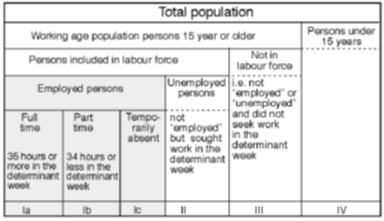 Figure 2.1 Labour survey definitions used by FAFO. On the basis of a person's activities in the so-called "reference week" the labour force framework divides the survey population, 15 years or older, into three exhaustive and mutually exclusive categories: the employed, the unemployed, and persons outside the labour force. In the FALUP 93 survey the "reference week" varied over geographical areas in the time period from September to October 1993. Work activities conducted by prisoners, children under the age of 15, or by Israeli settlers are not included in the survey. No upper age limit for respondents was introduced because of the relatively small proportion of old persons in the population. The "employed" (box Ia, Ib and Ic) comprise all persons who worked at least one hour in the reference week, or persons who were temporarily absent. Persons working 34 hours or less during the reference week were defined as part-time workers; those working 35 hours or more as full-time workers. The "unemployed" (box II) are persons who did not work even one hour in the designated week, but who were actively seeking work. Employed and unemployed persons taken together make up the "currently economic active population" or "labour-force". Persons 15 years or older who are not "currently economic active" and children together make up the "not in the labour force" category (box III and IV). The ILO labour-force classification system is based on time worked rather than income. Working for many hours by no means guarantees correspondingly high income levels. On the contrary, many low-productivity jobs are implicitly based on long working hours that compensate for low hourly wages. All the same there are two main reasons for adhering to time- rather than income-based definitions for labour activities. First, income, unlike time worked, may be transferred among reference periods, and thus may be difficult to integrate into a labour-force framework with a short reference period. This problem is manifest in agricultural work where income appears when the produce is sold, even though work has been carried out throughout the whole agricultural season. Second, fear of taxation and scepticism towards strangers asking about money matters, make it extremely challenging to obtain reliable informationon income from employment. Under-reporting and concealment of money inflows would be the most likely result. Contrary to the intentions of the ILO definitions, many respondents in household surveys tend to understand "work" as regular employment only. This misunderstanding leads to frequent under-reporting of much labour activities typical of developing countries, like casual work, unpaid family work and work remunerated in kind. In particular, under-reporting of female labour activities may be expected. To cope with this problem a particular section focusing on income-generating household activities rather than individual persons, was included in the survey questionnaire. Even though most income-generating household activities take place in a domestic setting, some, like trade and services, are normally carried outside the home. In spite of several problematic borderline cases, "income-generating household activities" was thus applied to activities that brought supplementary income to households. Activities carried out in the home and resembling ordinary employment, like for example sub-contracting and piecework arrangements, were covered by the standard labour-force framework questions. Results from the section about income-generating household activities will be discussed further at the end of the section about employment patterns, page 63. Crude labour-force participation rates See tables 2.1 to 2.7 in appendix 3 as references to the discussion in this section. The proportion of the population involved in the labour force is called the crude labour-force participation rate. This rate may be seen as directly reflecting two factors: the age distribution of the population, and the propensity of various population categories to work. Figure 2.2 presents a comparison between crude labour-force participation rates in Gaza and the West Bank refugee camps with those in Syria and Egypt, and for Jews and "Non-Jews" in Israel.