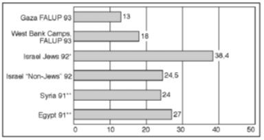 Percentage of all persons in respective populations The 1993 crude labour-force participation rates in Gaza and the West Bank refugee camps are not only far below that for Jews in Israel, but even lower than for other countries in the region. What can explain the extremely low participation rates in Gaza and the West Bank refugee camps? Table 2.1 gives some useful insights.