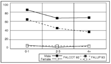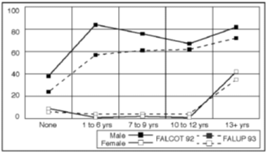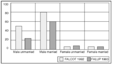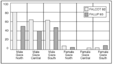 Percentage of all adults in respective groups in Gaza The greatest relative drop in male labour-force participation has been among non-refugees, who are over-represented in Greater Gaza City. Gaza males living in households with many other adult males have the largest reduction in labour-force participation. Figures 2.6, 2.7 and 2.8 compare Gaza labour-force participation in the FALUP 93 survey and the FALCOT 92 survey by individual characteristics such as gender, age, education and marital status. For males, the participation rate seems to have dropped for all groups, but most for those who are young, unmarried and less educated.