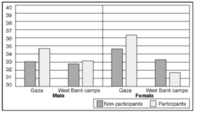 area and labour-force status As could be expected, those in the labour force in both main areas are better educated than are those outside the labour force. Regardless of sex, those in the labour force have on average 2-3 more years of education than non-participants. With regard to average age, differences by labour force status are small, due to two effects which tend to counteract each other. On the one hand, labour-force participation is lower among young adults because many are still students; on the other, it is also low among the elderly, who are often unwell. For male labour-force participants, regional differences in average age and years of education are relatively small. For (the small sample of) women, regional differences are larger, in particular with regard to average age. Interestingly, the difference between male and female labour-force participants takes opposite directions in Gaza and in the West Bank refugee camps. Gaza women are older and have less formal schooling than their male counterparts, whereas in the West Bank refugee camps the pattern is the inverse. Female participation in both areas is highest, relative to male participation, at the extremities of the educational ladder in particular at the top. This pattern was also observed in the FALCOT 92 report, which noted that "work" among women primarily tends to be understood as employment outside the home. Because of the greater acceptance of females working in professional rather than manual jobs, relatively many employed women hold mid-level professional jobs in public services (nursing, teaching, etc.). Table 2.1 clearly confirms the hypothesis of a dramatic reduction in male labour-force participation in Gaza and the West Bank refugee camps after the Israeli border closure in March 1993.
