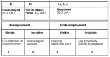 Figure 2.10 Types of labour under-utilization. In addition to the persons completely out of work - the regular "unemployed" - many employed persons also desire additional employment. These persons may be labelled visibly under-employed. Further, many workers are full-time employed in jobs with very low-productivity and wages. These workers can be characterized as invisibly under-employed. Finally, many persons outside the labour force are in reality so-called discouraged workers because they have simply given up trying to find work at all. See tables 2.12 to 2.17 in appendix 3 as references to the discussion in this section. "Unemployed" persons (box II) are defined by the ILO as those who did not work as much as one hour during the week prior to the interview, but who at the same time were actively seeking work. The state of unemployment may be considered as one extreme on a continuous scale from high labour activity to complete inactivity in the labour market. Figure 2.11 presents visible unemployment by gender and main area as share of the labour-force participants in each group. The 1992 unemployment rate as measured by the FALCOT 92 report has been used as a reference for Gaza males.