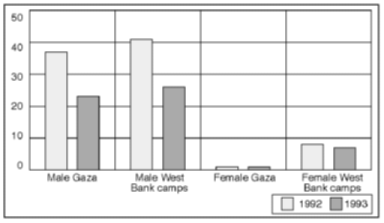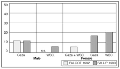 Figure 2.11 Unemployment rates, by gender and main geographical area (ILO definitions). Percentage of labour-force participants in respective groups From figure 2.11 we see that 1993 male unemployment rates in Gaza are higher than in the West Bank refugee camps. In both main areas, unemployment is higher for women than for men, which may indicate particularly strict requirements as to "acceptable" workplace and type of work for women. The critical question concerning unemployment is why the general 1993 visible unemployment rates in Gaza and the West Bank refugee camps are in fact so much lower than many might have expected. The March 1993 border closure could have been expected to generate a steep increase in unemployment rates in the short term. First, there is a direct effect of workers losing employment in Israel. Second, workers' loss of income induces negative domestic multiplier effects on aggregate demand. From figure 2.11, we see that unemployment in Gaza as of late 1993 is, however, the same as measured by the FALCOT 92 report. (The sample size for the West Bank refugee camps in the FALCOT 92 report is too small to permit comparison.) Several hypotheses may be suggested to explain the lack of change in the Gaza unemployment rate: First, the "no change" hypothesis stipulates that access for Gaza workers to the Israeli labour market had already been restricted ever since the Gulf War in January 1991. The March 1993 border closure thus made little difference. Second, the "smooth adaptation" hypothesis assumes that Gaza workers were willing to accept lower wages to obtain employment. That is, most workers who lost employment in Israel quickly acquired and accepted lower paid employment locally in Gaza. Third, the "measurement problem" hypothesis claims that open unemployment rates have little validity as indicators of under-utilization of labour in the Occupied Territories. They consequently must be supplemented with other measures. Returning to the "no change" hypothesis, let us compare the share of workers who mainly worked in Israel in the autumn of 1993 with the corresponding share for the same period in 1992. Both shares are calculated as a percentage of the total number of persons employed at least one week in the two respective four-week periods. Figure 2.12 presents the results by gender and main geographical area.