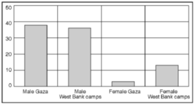 Figure 2.17 Reasons for not working or seeking jobs among "discouraged workers", by gender and main geographical area. Percentage of adult "discouraged" workers in respective groups Figure 2.17 indicates large differences by gender, and for women, also by area of residence. For men, the main reasons stated by respondents in both areas are security-related. These include "administrative measures" like "green card", lack of permit, town arrest, etc. Note that persons imprisoned for "security" reasons have already been excluded from the survey population). 4 Most of these measures relate to restrictions on employment in Israel or in Israeli institutions and settlements in the Occupied Territories. The high number of males defined as "discouraged workers" because they do not seek work due to security-related measures, can be interpreted in several ways: First, "discouraged Palestinian workers" seem to blame Israeli policy for lack of effort in even looking for work. Israel is consequently the target for frustrations due to lack of employment among these persons. Second, there seems to be a widespread Palestinian desire for employment in Israel, or in Israeli institutions and settlements in the Occupied Territories, despite the inconvenience, and degradation often associated with border control procedures. This indicates that wage levels for workers from the Occupied Territories employed by Israelis are relatively high compared to other employment available to Palestinians, even if they are less well paid than their Jewish colleagues. Third, the reservation wage of the "discouraged workers" (i.e. the lowest wage for which they will offer employment), still seems above the wage level currently obtainable in the Occupied Territories. The real search for (any kind of) local employment has thus not yet been launched. Finally, the large proportion of male "discouraged workers" giving security-related reasons for not seeking work, may possibly indicate that the border closure is regarded as a temporary situation. Expectations of improvement in the future are based upon the experience of numerous fluctuations between tighter and more relaxed border restrictions in recent years. Among women living in West Bank refugee camps, security-related measures are cited as important reasons for not working, whereas they are of little importance to Gaza women. A possible explanation for this regional difference is that scepticism to female employment in Israel is particularly strong in Gaza. A relatively high number of women report that they have given up looking for work or finding work that accords with their vocational training. As for unemployed women, this may indicate particularly strict requirements as to "acceptable" female workplaces and types of occupation. Figures 2.18 and 2.19 show regional distributions of "discouraged workers" by gender, age and education. In both main geographical areas, "discouraged workers" are predominantly young males with above average education. No difference in the prevalence of "discouraged workers" could be found across refugee status in Gaza.