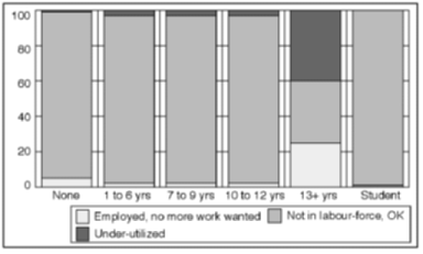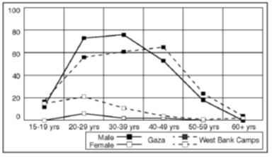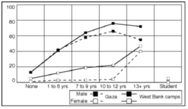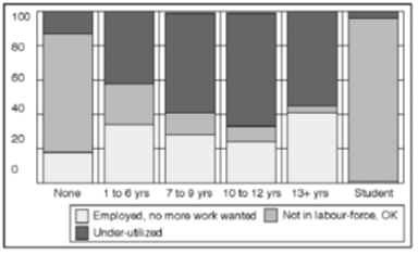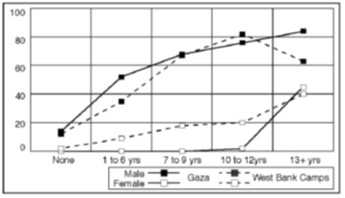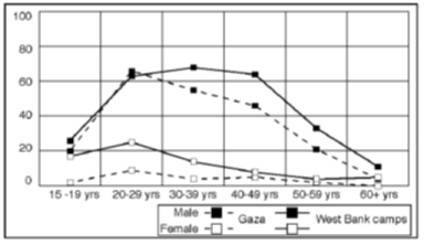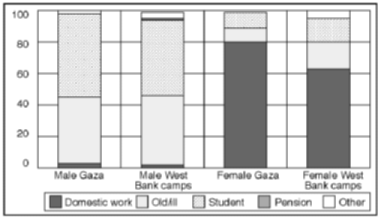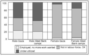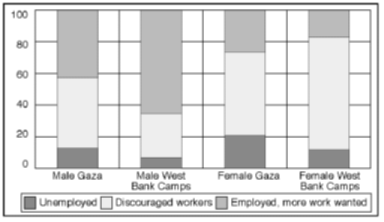 Figure 2.29 Female employment situation, by gender and education in Gaza. Percentage of adult women in respective groups A breakdown of the results for women by age and education indicates that the future may see major changes in the pattern of "inactive" women with no desire to join the labour force. The aggregate results seem to cover strong effects along a dimension of exposure to modern society and thinking. On the one hand, there is a majority of voluntarily inactive old or less educated women, particularly in Gaza. On the other, we find a minority of young, highly educated women who want more work, or who wish to start to work, particularly in the West Bank refugee camps. In both main geographical areas a high number of young and middle-aged, well-educated men want to change their current labour-force status. Two-thirds of Gaza men aged 20-29 years can be classified as under-utilized. Almost as high levels are reached for men of the same age in the West Bank refugee camps. This high under-utilization of youth and middle-aged, well-educated men represents a tremendous waste of some of the most productive groups in the Occupied Territories. The problem is aggravated by the risk of a permanent reduction in the productive potential of those completely inactive, the unemployed and "discouraged workers". The high number of under-utilized youth and middle-aged men, culturally expected to provide for their families, proves the existence of a reserve army of male workers. An outward shift in demand for labour is likely to lead to a steep increase in labour supply within relatively short periods of time. The size of the group of under-utilized persons is thus an important factor to be considered in labour market planning. The most serious problem stemming from the large numbers of young, well-educated and under-utilized men is the vast potential they represent for social unrest and violence. These males with ample resources, and most probably frustrated with their current employment situation seem to direct much of their dissatisfaction towards Israel. Failure to defuse this "social bomb" in the very near future may jeopardize the creation of conditions necessary for economic growth. Reducing under-utilization of labour in the Occupied Territories will thus be a crucial challenge for the Palestinian self-governing authority. If it does not succeed, it may end up replacing Israel as the scapegoat for social frustration and dissatisfaction.