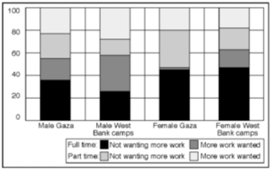 Figure 2.24 types of under-utilization of labour, by gender and main geographical area. Percentage of under-utilized adults in respective groups On average just slightly more than one-tenth of this group are the regularly unemployed. In both regions the majority are employed persons who desire more work, or "discouraged workers". The variations in the content of the group of under-utilized persons will be further discussed in the next section concerning future labour-force scenarios for Gaza. A caveat is called for concerning both these two last sub-groups. The desire for (more) work among these persons obviously has implicit references to "acceptable jobs" and "acceptable wage" levels. It is thus not clear under exactly what conditions they would be willing to take on (more) work, and what specific efforts they might consider or initiate to obtain (more) employment. ILO's standard "labour-force framework" is based on actual (objective) behaviour rather than perceptions and opinions. The reference to "acceptable jobs" and "acceptable" wage levels introduces a fairly subjective and hypothetical element into the ideally "objective" description of the labour-market situation. Still, this classification system may be useful for at least three reasons. Firstly, because most of the under-utilized persons can be assumed to be frustrated with their current labour-force status, it represents an important indicator of social frustration and discouragement. In particular the group of "discouraged workers" expresses a mixture of a sense of resignation (expressed by lack of belief in the point of even trying to look for a suitable job), and targeted dissatisfaction (Israel is the scapegoat, by failing to issue various permits indispensable in many types of jobs). Second, the less than full utilization of under-utilized persons represents a severe loss in well-being at the societal, the household and the individual levels. Unemployed persons and "discouraged workers" represent a productivity loss for society, as their whole potential output is lost as long as their involuntary inactivity persists. Permanent reduction in the productive potential of both unemployed persons and "discouraged workers" may be one of the lasting effects of such undesired inactivity. Third, the group of under-utilized persons in many ways proves the existence of a reserve army of workers which, under certain conditions, could increase their individual labour activities within relatively short periods of time. This labour reserve should be seen in contrast to the labour reserve among "non-discouraged workers" outside the labour force (housewives, etc), which is likely to become available only over a longer period of time. It is reasonable to assume that an increase in wages stemming from a positive shift in demand for labour will generally also lead to an increase in supply of labour. The size of the group of under-utilized persons is an important factor to be considered in employment planning. It has particular relevance when evaluating short-term effects of shifts in demand for labour, but also when making labour-force projections for the long term. These points will be further discussed at the end of this chapter. We may now turn to the section of the prevalence of under-utilization of labour in Gaza and the West Bank refugee camps. Here we divide the working age population into the three main groups described above: Employed, no more work wanted; non-active, no more work wanted; and under-utilized persons. As can be seen from figure 2.25, almost half the of adult males in both areas are under-utilized. In particular for Gaza, where all types of localities are represented in the survey population, these results paint a worrisome picture of profound social frustration.