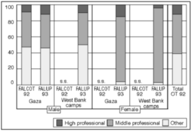 Figure 2.13 1993 and 1992 male employment in Israel by sub-area. Percentage of adults in respective groups employed one week or more during a four-week period prior to the survey, (October/November 1993), and the corresponding period in 1992 The Southern and Central West Bank refugee camps are the only region where the "no change" hypothesis may have some relevance. 20% of the population live in Arab Jerusalem (Shufat and Kalandia refugee camps), and consequently do not need permits to enter Israel. In the Jerusalem area, many Israeli checkpoints can also be by-passed on foot by not using the roads. Still, even in this group, the net reduction of employment in Israel is as high as 23%. The "smooth adaptation" hypothesis assumes that Gaza workers were willing to accept lower wages locally to obtain employment. To test this hypothesis, we investigated the present labour-force status of males who mainly worked in Israel in the autumn of 1992, but not in the autumn of 1993. These workers (the gross reduction of employment in Israel), comprised approximately 1/2 of the workers who had worked mainly in Israel in the autumn of 1992. Figure 2.14 presents the results for this group of workers by main geographical area.