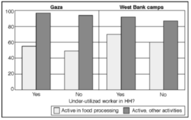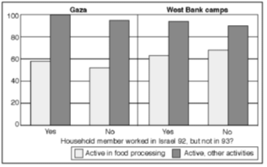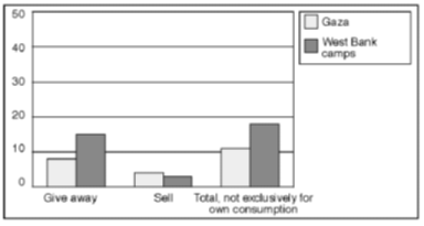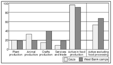 of all households in each area For many activities the limiting factor in production may be access to raw materials. Most agricultural activities plant or animal production, for example require land, and are thus less suitable in over-crowded refugee camps. Not surprisingly, figure 3.7 shows that the (land-owning) community of Gaza non-refugees is more involved in agricultural production than the (usually landless) camp refugees.