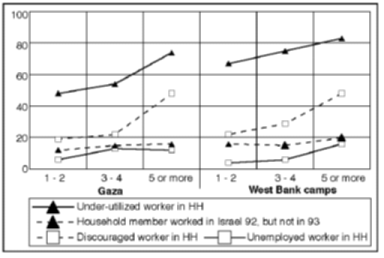 of all households in each area There are, however, two reasons for rejecting the "marginal role" hypothesis. Firstly, the strong correlation between increase in household production and increasing household size indicates that the principal economic significance of household income-generating activities is saving on consumption expenditures, rather than involvement in market transactions. Furthermore actual marketing of household production may be related to the locality of the household. The higher prevalence of services and trade in the West Bank refugee camps may be due to higher demand for such services in the West Bank and Arab Jerusalem than in Gaza. Thus, lack of purchasing power, just as much as features of the households or low value of household production, may explain why so few households market their products. Summing up, income-generating household activities do not seem to play any compensatory role in the short term, neither at the individual nor at the household level. Because of the low level of formal labour activity, and hence reservation wages among the primary agents in household activities, middle-aged and older women, meagre revenues from household production may only to a limited extent explain the lack of increase in production output. The prevalence of household production increases with household size. This finding indicates that these activities may play an important role in household economy by reducing consumption expenditures, despite of low involvement in market transactions. The survey interviewing was conducted in October/ November 1993, only about half a year after the border closure. We cannot rule out various constraints in initiating or increasing household production as an explanation of its apparent stability. Changes in household production are also obviously linked to expectations about future employment prospects. At the time of the interviewing there were relatively high expectations about an imminent Israeli withdrawal from Gaza and Jericho. As such withdrawal was expected to be followed by considerable foreign aid to all of the Occupied Territories, this may have acted to restrain an augmentation of household production.