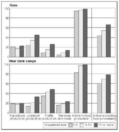 of all households in respective groups Food processing is to a significant degree dependent on raw materials from agricultural production. Because some food processing is carried out in almost all households, and because the absolute level of output is not measured, factors that may possibly limit food processing cannot be identified. Both food processing and plant production may be expected to show strong seasonal variations. In contrast to agricultural-related activities, craft production requires little space or land, and may thus be better suited to refugee camp households. Figure 3.7 shows that both craft production and trade and services are more prevalent in West Bank refugee camps than in the Gaza Strip. While craft production is more common among refugee camp households, locality of residence and refugee status do not seem to affect the prevalence of trade and services in Gaza. Because many non-agricultural household activities are dependent on raw materials bought in markets, UNRWA support in training and in the provision of raw materials may help to explain the higher level of craft production in the refugee camps. Does the amount of available manpower constrain household production? Figure 3.8 shows that household income-generating activities (except plant production and food processing) tend to increase with household size. On the other hand, this may equally well be due to the fact that the potential for saving consumption expenditures increases with total household size, because large households include more potential producers.