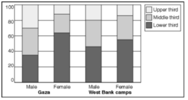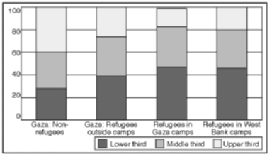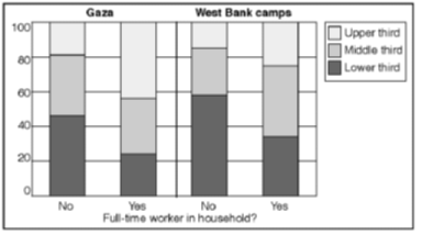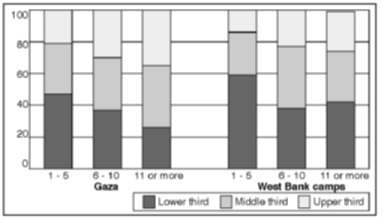 participant in household. Percentage of all households in respective groups Even though two out of three households without labour-force members rely mainly on income originating from various private sources, it seems that it is difficult for private arrangements like family and other personal social support networks to cover the needs of all households in this situation. In the West Bank refugee camps three times, and in Gaza five times as many of these households rely mainly on public transfers like UNRWA support, social benefits and zaqat money than on private arrangements. As was the case with households with at least one full-time worker, we may also assume that many households without labour-force members have been in this situation for some time. Comparing how these households on the index for household possession of consumer durables with other households yields a picture quite the opposite as for households with at least one full-time worker. From figure 3.27 we see that in both main geographical areas households without labour-force members are over-represented in the lower, and under-represented in the upper wealth group.