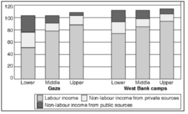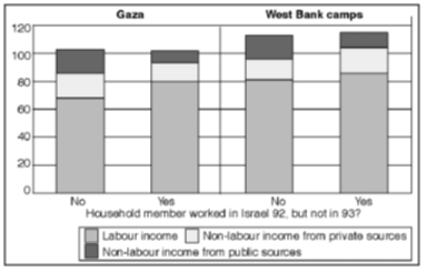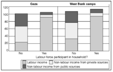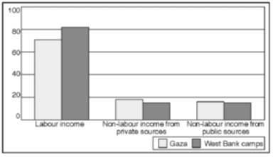 The classification "no labour force member" in table 3.2 refers to the last week prior to the survey, while prevalence and importance of income types refer to a somewhat longer time period, "at the time of the survey". The reason labour income still holds "main importance" in at least one fourth of the households with no labour-force members is thus (casual) labour activity among household members prior to the week in question. The high number of households receiving "other" income is in many cases also due to various kinds of casual work in the reference week, not reported in the questions about individual employment. Income from trade and business establishments, which tend to reflect more permanent employment, is virtually absent from the households with no labour-force members. Households without labour-force members do not rely more on sale of possessions than other households, probably because they own little in the way of salable goods anyway. A relatively high number of them are dependent on remittances, indicating that the household nevertheless lives off labour income, although provided by family members working abroad. In contrast to zaqat money and social benefits, there is little variation in the prevalence of households receiving UNRWA support. The importance of UNRWA support is, however, much greater in households without labour-force members than in other households, while zaqat money and social benefits seem to play a more supplementary role. Figure 3.26 sums up the importance of the three main groups of household income for households with and without labour-force members. We see that in both Gaza and West Bank refugee camps, households without labour-force members rely primarily on non-labour income from private sources. 3