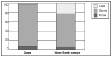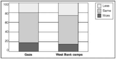 Percentage of all households in respective groups Respondents were asked explicitly about changes in these income types since summer 1992, (i.e. the time of interviewing for FALCOT 92). However, many income types are received by so few households as to make it meaningless to construct any sub-division here. The March 1993 border closure in effect represented a negative shift in demand for labour; and this, according to economic theory, should lead to a reduction in both wages and the volume of employment. Being the product of these factors, a substantial decrease in income from labour activity should thus be expected. However, for all types of labour income, the majority of households in the sample reported "no change" in income since 1992. In the West Bank refugee camps there seem to have been a downward shift in wages, in particular in the Northern camps. In Gaza, on the other hand, the size of the group reporting more wages almost equals that reporting less wages. Figure 3.13 presents a regional overview of reported changes in wages from 1992 to 1993.