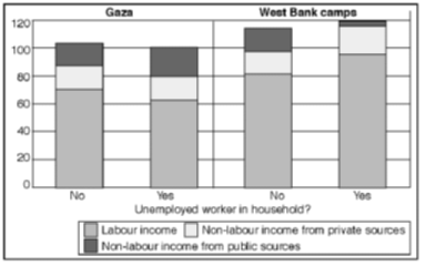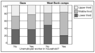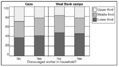 worker in household. Percentage of all households in respective groups Non-labour income from public sources is not systematically more important in households with unemployed and discouraged workers than in other households. In the West Bank refugee camps, the proportion of households relying on non-labour income from public sources is even lower among households with unemployed and discouraged workers than among other households. These results do not lend support to claims that non-labour income from public sources for example, UNRWA is the main factor halting a decline in the reservation wages of unemployed and discouraged workers. Figures 3.18 and 3.19 provide further support to the "family employment network" hypothesis. In both main geographical areas the distribution of the index for household possession of consumer durables across households with unemployed and discouraged workers is hardly different from the distribution in other households.