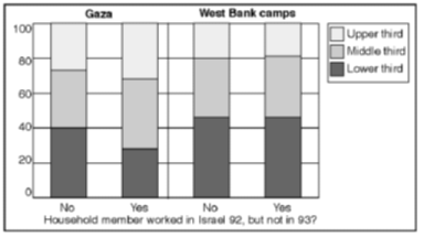 groups of households The proportion of households receiving labour income tends to increase with household wealth. For the dominant labour-income type wages the increase is particularly marked from the lowest to the middle wealth group. In Gaza, agricultural income is also associated with (relatively) high wealth. In dealing with household income-generating activities no indications were found that these activities had increased so as to compensate for lost income from formal employment, neither at the individual nor at the household level. If household income-generating activities had played a compensatory role, higher proportions of income from home production and self-employment could have been expected in the lower household wealth groups. Here we see that the proportion of households receiving income from home production and self-employment increases with household wealth, which confirms our findings in the section about household income-generating activities. The types of labour income most clearly associated with "high" household wealth are income from trade, industry and service establishments. Similar findings were made in FALCOT 92. This observation does, however, not necessarily reflect a favourable climate for such establishments in the Occupied Territories. Because of the virtual absence of non-personal financial institutions for capital supply, high wealth may be a pre-condition for starting up trade, industry and service establishments, rather than a result of such activity. Non-labour income types from private sources are somewhat over-represented in the lowest household wealth group. This is due largely to the high number of households in this group reporting "other income" as being of "main importance". This finding is in line with the observation that poor households usually pursue multiple economic strategies. Remittances and pensions are not found to be associated with any particular wealth group. As could be expected, the few households receiving rent revenues are over-represented in the upper wealth group. Sale of possessions is not particularly associated with the lowest wealth group, probably because the poorest households also have the fewest assets to sell. (Many household often have only a used fridge or radio). Are various social support arrangements from UNRWA, the Israeli Civil Administration, etc., received primarily by the poor and presumably needy households? For all three types of support, the proportion of recipient households decreases with increasing wealth. The only exception here is UNRWA support among households in the West Bank refugee camps. Also many households in the "highest" wealth group receive UNRWA support. However, this finding does not necessarily indicate "incorrect" priorities within the UNRWA support system. First, it should be remembered that all areas to be included in our survey population were selected on the basis of having below average scores (relative to the Occupied Territories) on the index for household possession of consumer durables in FALCOT 92. Second, the index is relative; belonging to the "highest" household wealth group does not necessarily imply a satisfactory level of material welfare for households in this group. Third, UNRWA runs various relief programmes. Some of them distribute support to all refugee households. Other programmes, like the "Special Hardship Cases", are means-tested and thus distribute support only to particularly needy refugee households. 2 Because we do not know the absolute level of support, the high proportion of households in the lowest wealth group relying on UNRWA support could be interpreted in quite different ways. "Main importance", being defined relatively to total household income, could on the one hand indicate that current support levels for the poorest households are high in absolute terms. On the other hand, it could indicate that these households receive so little other income that even low levels of UNRWA support constitute a major component of total household income for them. As a conclusive remark it should be stressed that figure 3.15 illustrate correlations between household income types and household wealth, and not necessarily casual relations which can take various directions. It is for example reasonable to assume that receiving wages, and hence holding employment, may yield a higher score on the index for household possession of consumer durables. Receiving economic support from UNRWA on the contrary, is obviously the condition for, rather than the reason behind, a low household wealth score. The "family employment" network hypothesis We will now proceed with the investigation of income types of households whose members face employment problems after the closure. The "family employment network" hypothesis stipulated that individuals facing employment problems primarily rely on the labour activity of other household members for economic support. The reservation wage level of unemployed and discouraged workers must thus to a large extent be assumed to depend on the labour activity of other household members. To test this hypothesis we have singled out three groups of households. First, households with at least one unemployed member. Second, households with at least one "discouraged worker". Third, and partially included in the two first groups, households where at least one member lost employment in Israel from 1992 to 1993. Neither figure 3.16 nor 3.17 seems to contradict the "family employment network" hypothesis. In the households with unemployed and discouraged workers, the majority rely primarily on labour income which must be assumed to stem from the labour activity of other household members.